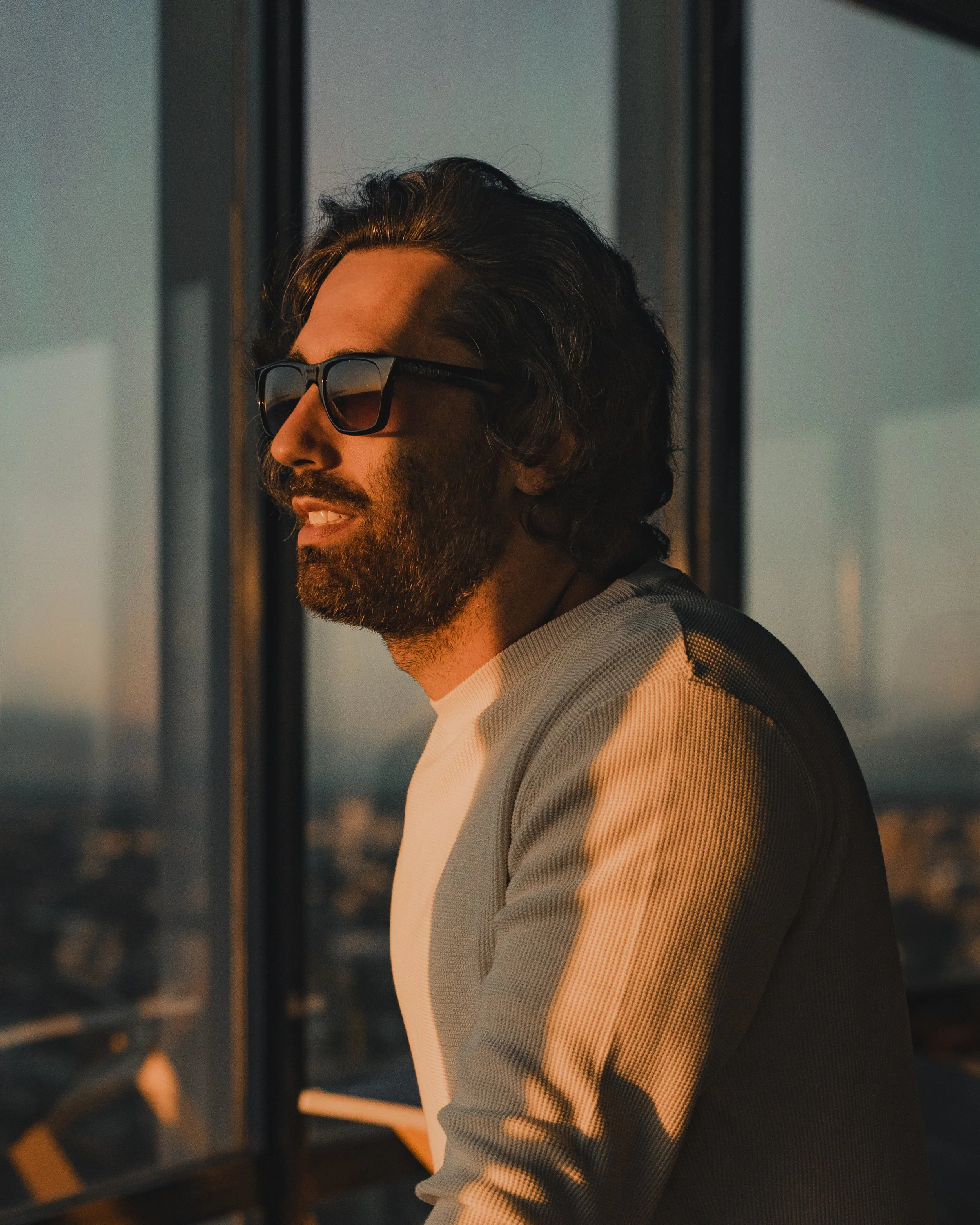 Homem de barba com óculos de sol olhando para o horizonte ao pôr do sol, ao lado de uma janela de vidro de um prédio alto.